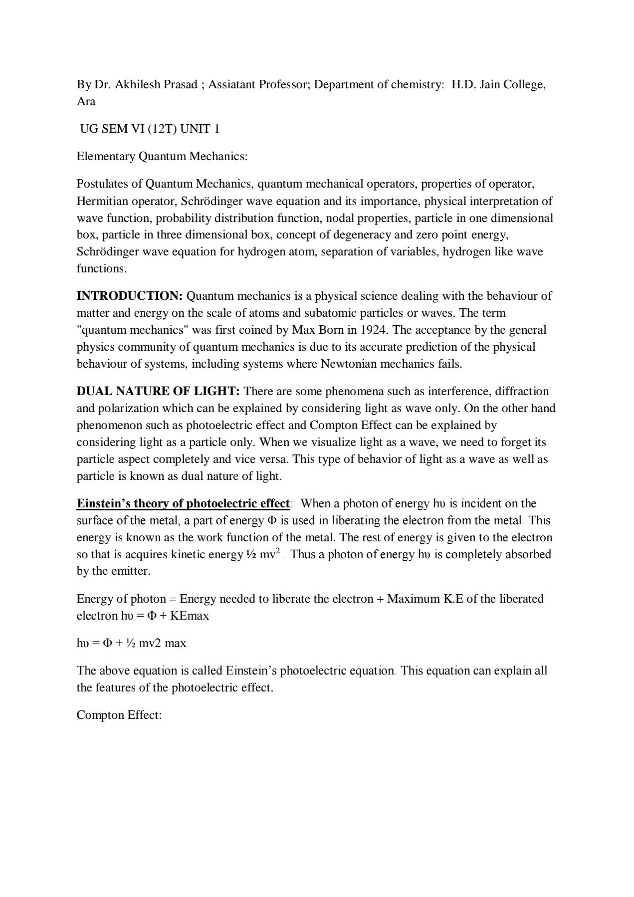 | 10 | Quantum mechanics | Dr. Akhilesh Prasad | UG | B.Sc | Semester VI | 24-02-2026 | View |